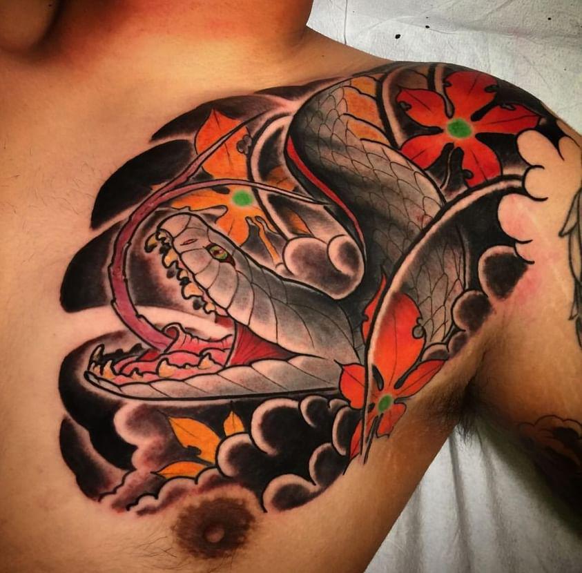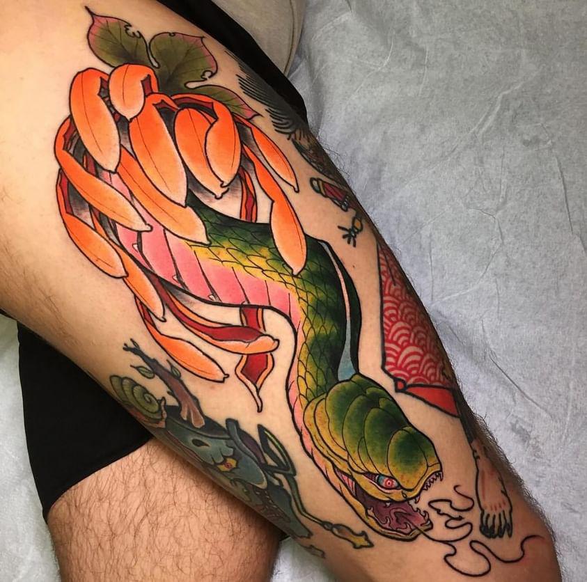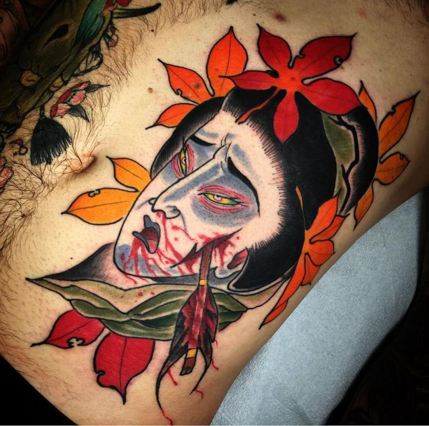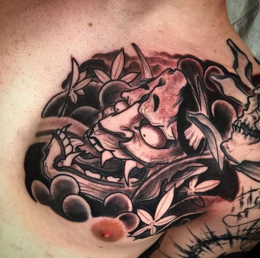 Quoi que je fasse, mes dessins prennent toujours une esthétique asiatique. Tout ce qui est japonais est ce qui m’excite vraiment. Cela dit, je viens de l’école de vous devriez être capable de tout faire bien. Donc, si quelqu’un veut du trad, de la fine line, du tribal ou du script, j’adore le faire aussi !